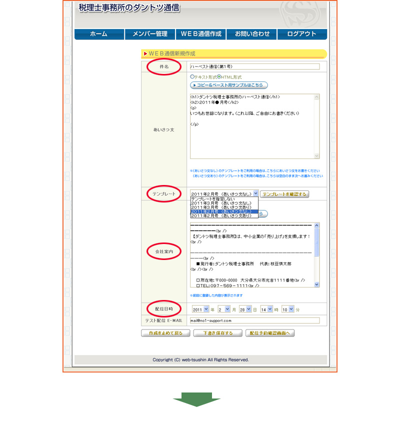 ●作成画面では、赤丸の[件名][テンプレート][会社案内]にWEB通信の