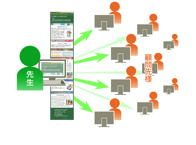 とはいえ「セミナーや異業種交流会などで名刺交換をした方にまで両方を送るとどうしてもコストが…」という場合 には、顧問先様や頼りになるキーマンには[紙で送るアナログ版ニュースレター]と[WEB通信]の2つを送り、 見込み客様には[WEB通信]だけを配信するといった使い分けもひとつの方法です。